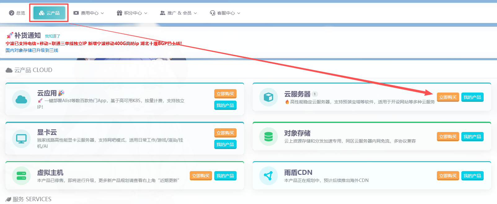 选择云产品-找到云服务器-点击立即购买