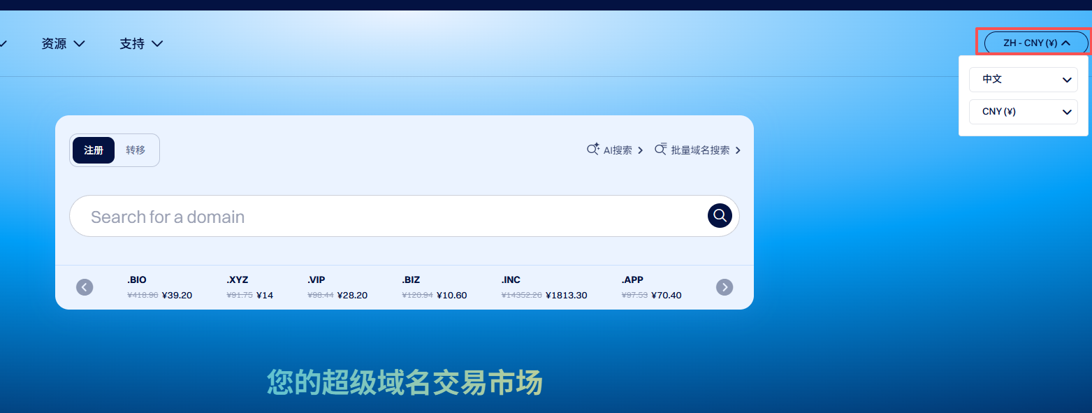 注册一个账号,搜索一下你想注册的域名。这个服务商对国内用户是非常友好的,页面是可以直接选择全中文化的,也支持支付宝付款,有在线的中文人工客服,响应也非常迅速。我买的com域名,我对比了一下也是最便宜的。关于为什么不用国内注册商,第一时价钱比这贵一点。第二是国内注册商注册域名又是实名认证,又是域名审核啥的,非常麻烦,海外注册商直接用的方式我是更加喜欢的。