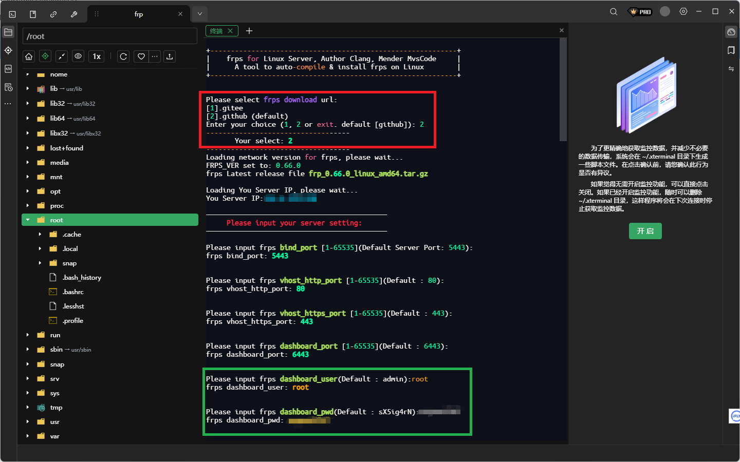 出现frps download这里需要选择2(红框中),please input your server srtting以下的信息除了账号密码自己设置一下(绿框中)其他的一律全部回车默认就可以了