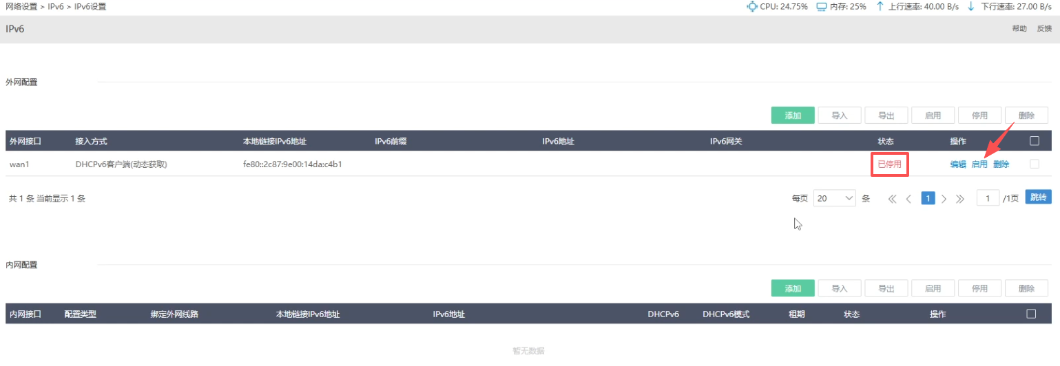 打开iKuai管理后台-网络设置-IPV6-IPV6设置,将外网接口的配置启用