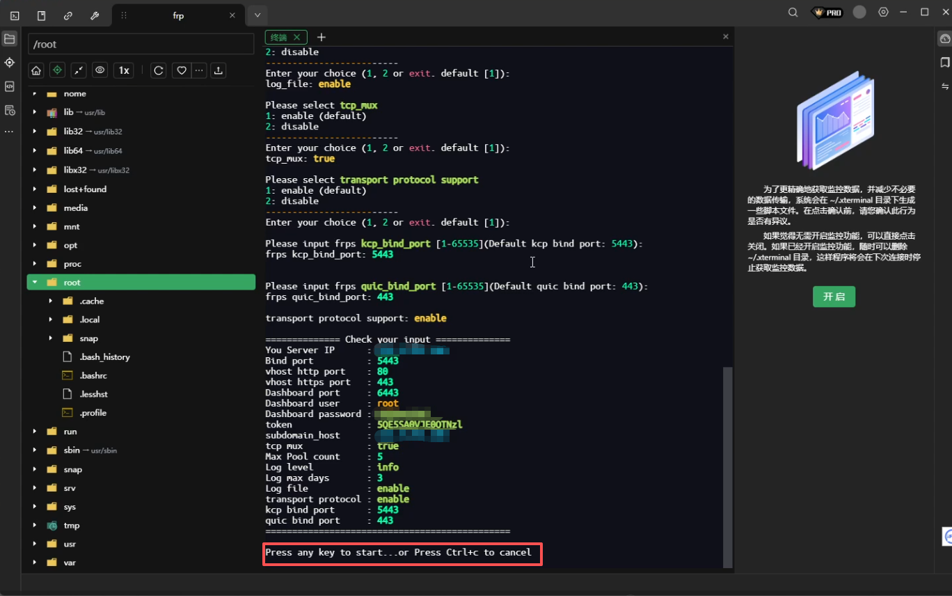 出现frps download这里需要选择2(红框中),please input your server srtting以下的信息除了账号密码自己设置一下(绿框中)其他的一律全部回车默认就可以了