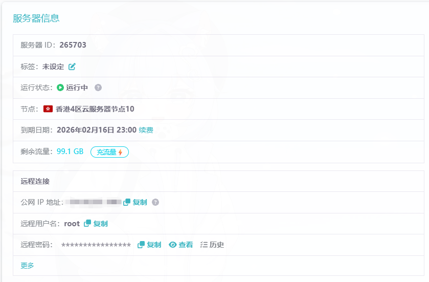 购买完成之后进入到服务器管理页面,可以看到服务器的管理信息