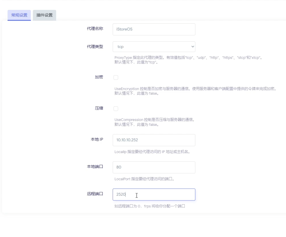 输入相关代理的信息(本地IP就是这个服务在我们本地的IP、本地端口就是这个服务在我们本地的端口,比如istoreos用网页打开是http协议那么就是80端口、远程端口就是你想映射到服务公网IP的那一个端口上,访问地址就是公网IP:2520)