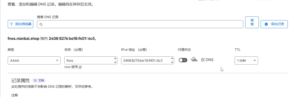 在cloudflare域名DNS管理页面添加一条新的IPV6 DNS记录(类型AAAA就是IPV6记录)