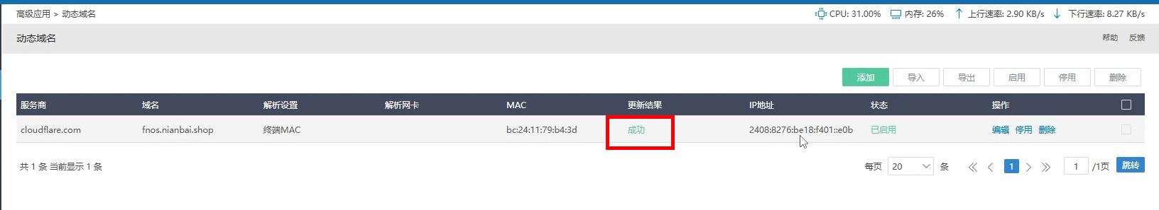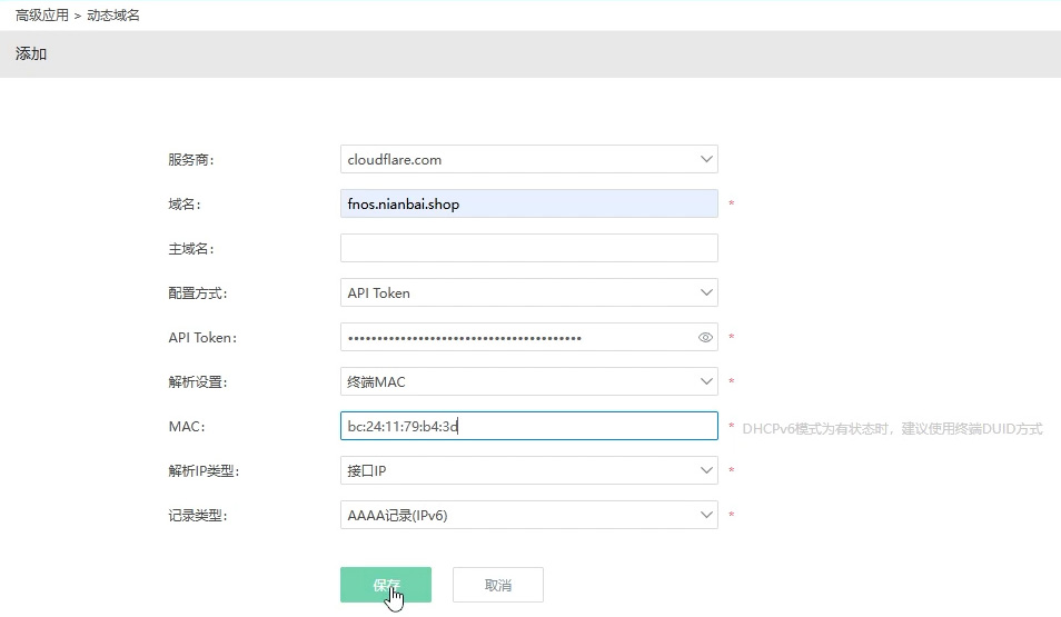 服务商选择cloudflare.com,域名填写上我们刚才创建DNS记录的域名,配置方式选择API Token,将刚才获取的令牌密钥复制到API Token,解析设置选择终端MAC,将需要访问的设备Mac地址复制到MAC里面
