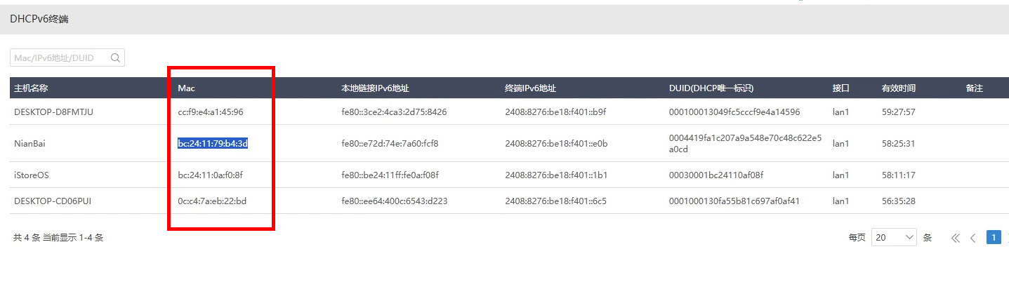 来到iKuai系统-DHCPV6终端,将你需要外网访问的设备或服务的Mac地址也复制到一个记事本